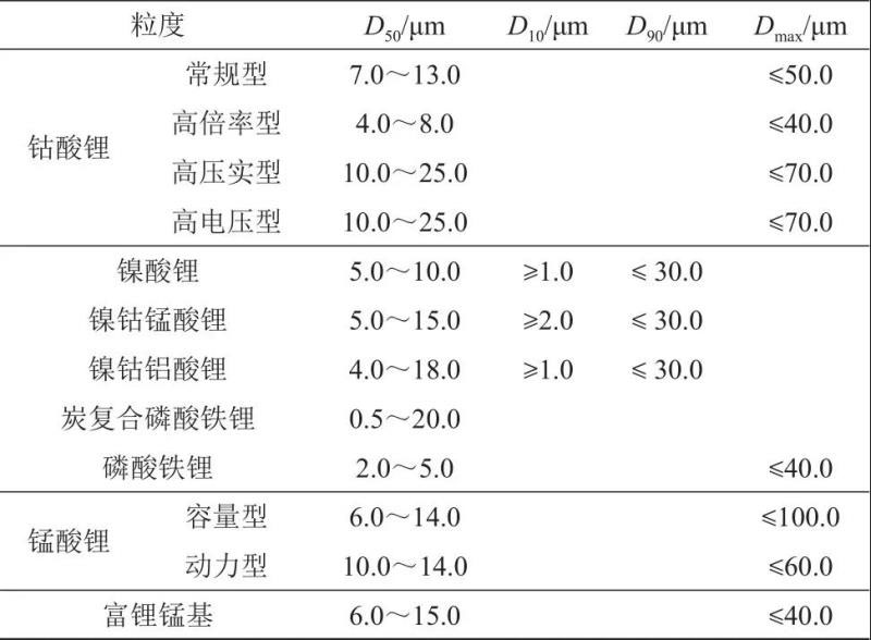 正極材料的顆粒大小通常采用激光粒度儀測試,將粒度分布曲線中累積分布為50%時最大顆粒的等效直徑D50視作平均粒徑。正極材料粒度及其分布是與前驅體、燒結、破碎工藝密切相關的,通常情況下應呈現正態(tài)分布。鈷酸鋰一般以四氧化三鈷和碳酸鋰為原料制備,其燒結特性很好,可通過控制Li/Co、燒結溫度、升溫速度等關鍵因素使其長大,因此對原料要求較低。通過燒結粘連長大、破碎的粉體材料易出現大的異形顆粒,制漿涂布成型時易出現劃痕、斷帶,因此鈷酸鋰標準對粒度分布曲線中最大顆粒的等效直徑Dmax作了限制。