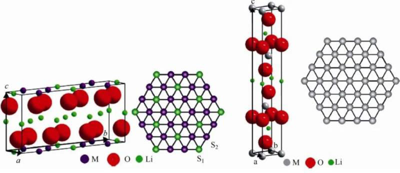 富鋰錳基材料被認為是六方的LiMO2和單斜的Li2MnO3的固溶體(圖6),它同樣沒有一張專屬的JCPDS卡片。單斜相可引用JCPDS 27-1252#卡片,其結構特點是有1/3的Li+占據了3b位,表述為Li[Li1/3Mn2/3]O2形式更為貼切。