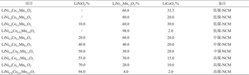 據此相圖,可將NCM分為低鎳(Ni<50%,摩爾分數)、中鎳(50%≤Ni≤65%)和高鎳(Ni>65%)等不同類型。低鎳-NCM材料特點是幾乎全部以空氣中穩(wěn)定的LiNi1/2Mn1/2O2和LiCoO2形式存在,不含穩(wěn)定性差的LNO組分,或LNO僅占10%以下,可以在空氣中像LCO、LMO那樣容易制備;中鎳-NCM材料的特點是LNO組分有所增多,但仍處于50%以下,稍加控制還可在空氣中制備;高鎳-NCM材料的特點是LNO組分占絕大多數,必須在氧氣條件下才可制備。NCA材料類似于高鎳-NCM。