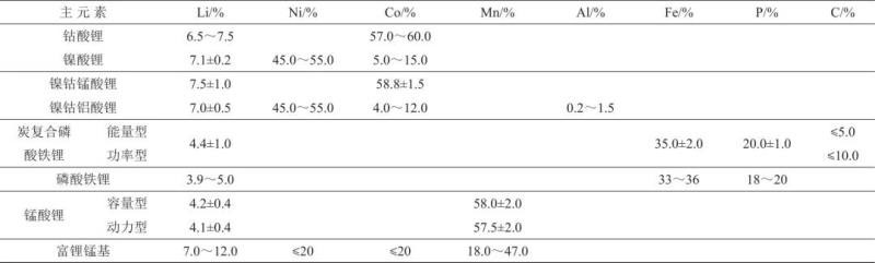 鋰離子電池中的正極材料都是含鋰的氧化物,一般鋰含量越高,容量越高。比如錳酸鋰的Li含量僅為4.2%,而鈷酸鋰和鎳酸鋰達到約7.1%,富鋰錳基的則高達約10%。材料組成固定的話,主元素含量應該以實際測試平均值加公差的形式給出,以達到相應的電化學活性并保持批次之間的穩(wěn)定性。例如《錳酸鋰》就是以中心值加公差形式,公差越小,說明Li/Me配比控制越精準。而基于LiNiO2摻雜改性的NC、NCM、NCA等正極材料,因其Co、Mn、Al等摻雜元素含量不確定,就無法以中心值加公差的形式表示。Ni、Co、Mn三種元素的原子量比較接近,為簡化起見,YS/T 798—2012《鎳鈷錳酸鋰》甚至直接采用了控制“Ni+Co+Mn”總量的方式。從GB/T 26031—2010《鎳酸鋰》的組成不難判斷,這個材料除Ni外,還含有5%~10%的Co,實際稱其為《鎳鈷酸鋰》更準確一些,之所以被誤稱,可能也有歷史的原因。