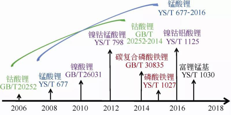 鋰離子電池正極材料在2000年前后開始國產化,最初進入市場應用的主要是鈷酸鋰和少量的錳酸鋰,因此GB/T 20252—2006《鈷酸鋰》是全國有色金屬標準化技術委員會組織發(fā)布的第1個正極材料國家標準。之后,《錳酸鋰》、《鎳酸鋰》、《鎳鈷錳酸鋰》、《磷酸鐵鋰》、《鎳鈷鋁酸鋰》、《富鋰錳基》等國家或行業(yè)標準先后推出(圖2)。其中,《鈷酸鋰》和《錳酸鋰》分別于2014年和2016年進行了標準修訂。