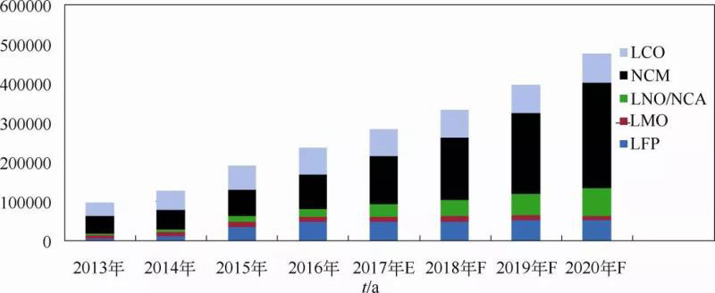 經過近30年的迅猛發(fā)展,鋰離子電池的負極仍以碳材料為主,而正極則出現了百花齊放、百家爭鳴的嶄新局面,基于上述科學家的研究成果,鈷酸鋰、錳酸鋰、鎳鈷酸鋰(LiNi1-xCoxO2,也稱NC)、鎳鈷錳酸鋰、鎳鈷鋁酸鋰、磷酸鐵鋰等正極材料陸續(xù)產業(yè)化,并被拓展用于眾多領域。根據數據統(tǒng)計,2017年全球鋰電正極材料市場用量已經達到28萬噸,并以每年超過10%的速率穩(wěn)步增長。隨著新能源汽車對高能量密度的需求,目前鎳鈷錳酸鋰已經成為最重要、占比最大的正極材料(圖1)。