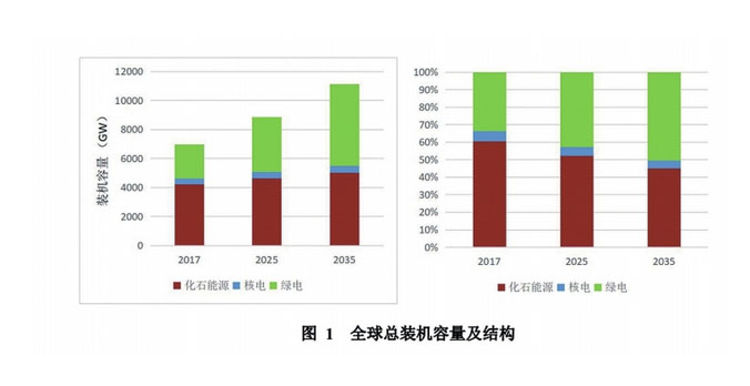 《變化趨勢》預計,未來全球發(fā)電裝機容量將持續(xù)增長,2025、2035年分別提升至8906吉瓦、11291吉瓦。其中,包含風、光、水、生物質(zhì)等綠色電力裝機占比將在2035年提升至50%,超越化石能源躍居第一位。