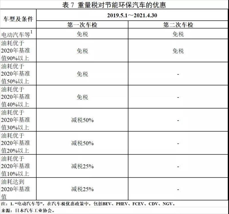 在汽車保有環(huán)節(jié)對節(jié)能環(huán)保汽車給予優(yōu)惠。汽車稅針對排量在0.66L以上的汽車征收,乘用車每年按照排量征稅,共分為10個區(qū)間,排量越大,征稅越多;2019年10月1日起,由于消費稅率的上調(diào),為降低消費者稅負,日本下調(diào)汽車稅稅率,調(diào)整后乘用車稅額為25000—110000日元/年(約合1750—7700元人民幣/年),其中小排量乘用車稅率下調(diào)力度更大。微型汽稅是定額稅,針對0.66L及以下的汽車征收,私人微型乘用車每年稅額為10800日元(約合756元人民幣)。重量稅依據(jù)重量征稅,私家乘用車稅率約為每0.5噸4100日元/年(約合287元人民幣/年),微型車稅率為定額3300日元/年(約合231元人民幣/年);車齡達到13年的車輛需繳納更高的重量稅,以加速老舊車的淘汰。為支持汽車向節(jié)能環(huán)保發(fā)展,包括下一代汽車在內(nèi)的符合節(jié)能環(huán)保要求的汽車均可享受不同程度的汽車稅、微型車稅、重量稅減免措施。