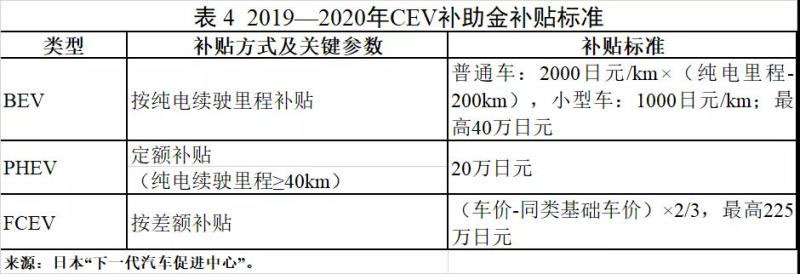 對不同類型電動乘用車采取不同的補貼計算方式及標準。日本從1998年起對購置清潔能源乘用車(包括混合動力汽車)進行補貼(CEV補助金)。政府設立下一代汽車促進中心(NeV),搭建車輛補貼信息平臺。2015年起,補貼對象范圍縮減為BEV、PHEV、FCEV和CDV。日本政府每年對補貼政策進行評估,決議下一年是否調(diào)整政策。2019—2020年,BEV單車補貼額依據(jù)純電續(xù)駛里程計算,最高40萬日元(約合2.6萬元人民幣);PHEV純電續(xù)駛里程不得低于40km,單車定額補貼20萬日元(約合1.3萬元人民幣);FCEV按照與相同或同等類型汽油車的差額進行補貼,補貼上限為225萬日元(約合14.9萬元人民幣)。此外,部分地區(qū)還提供地方購置補貼。
