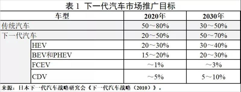 為降低汽車CO2排放并加強日本汽車工業(yè)的技術能力和競爭力,日本內(nèi)閣于2008年7月發(fā)布《創(chuàng)建低碳社會的行動計劃》,明確“下一代汽車”包括普通混合動力汽車(HEV)、純電動汽車(BEV)、插電式混合動力汽車(PHEV)、燃料電池汽車(FCEV)、清潔柴油汽車(CDV)、天然氣汽車(NGV)等車型,并提出力爭到2020年,下一代汽車在新車銷量中的占比達50%。2010年發(fā)布的《下一代汽車戰(zhàn)略(2010)》是對該文件的進一步細化和落實。