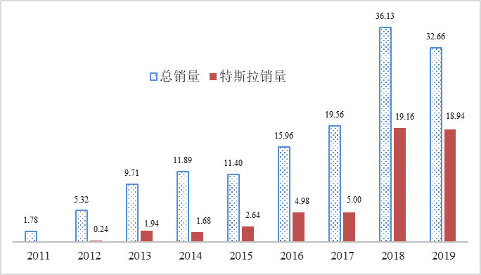 圖1 美國歷年BEV和PHEV總銷量及特斯拉銷量(萬輛)