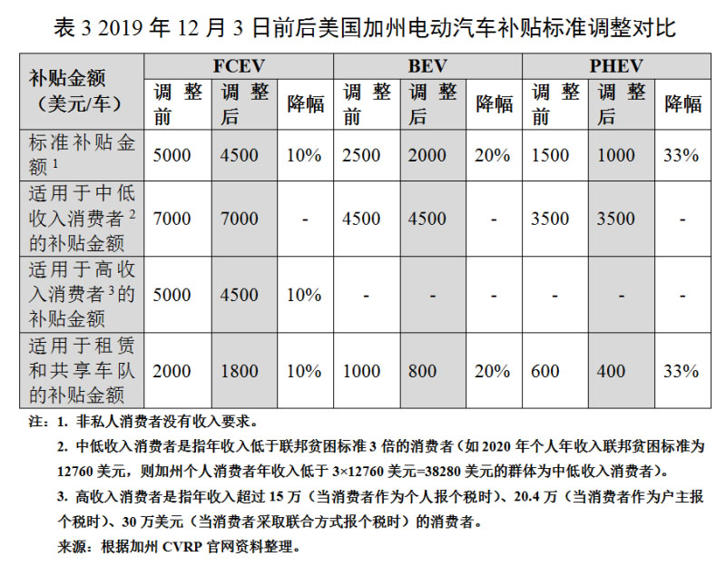 2019年底加州對CVRP進行了新一輪調(diào)整:補貼金額退坡、技術(shù)門檻提高。2014年以來,CVRP政策雖屢次調(diào)整,但單車標準補貼金額基本維持不變。然而隨著加州電動汽車市場規(guī)模增長,補貼申請需求大幅增加,項目預算往往無法支撐到每財年結(jié)束,為減緩預算資金的消耗速度,使更多需要補貼資金的人受惠,從而實現(xiàn)更有意義的市場激勵效果,CARB對CVRP政策進行了修改,并于2019年12月3日起實施:一是下調(diào)單車補貼金額。針對私人消費者(除低收入群體外)的標準單車補貼金額統(tǒng)一下調(diào)500美元;針對租賃和共享車隊申請者的單車補貼金額統(tǒng)一下調(diào)200美元。二是限制車價。除FCEV以外,廠商指導價超過6萬美元的車型(如特斯拉Model S和Model X)自2019年12月3日起不再享受補貼。三是提高技術(shù)門檻。PHEV純電續(xù)駛里程要求由20英里提升至35英里(約56公里)。四是加嚴申請次數(shù)限制。非租賃和共享車隊消費者,享受補貼的次數(shù)上限由2次降低為1次。