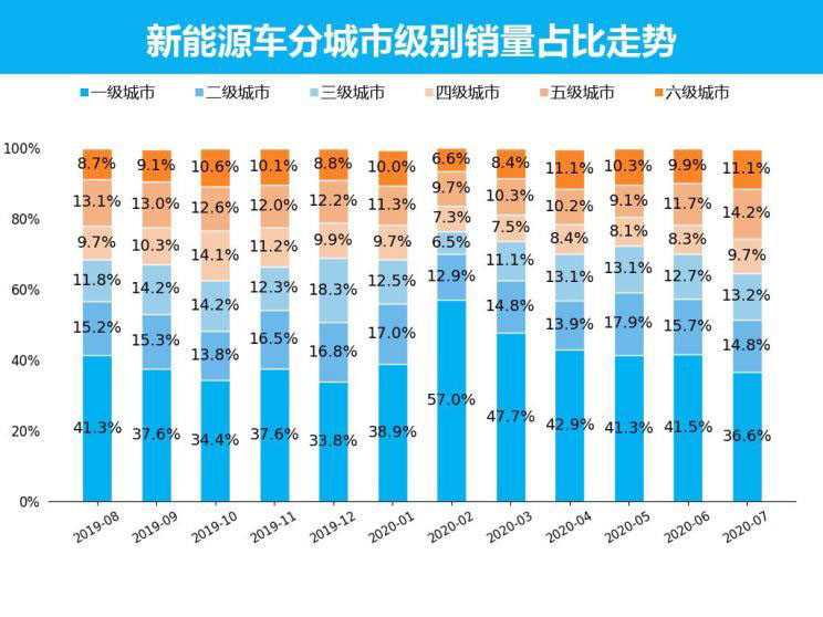 7月新能源車銷量最高的城市級別為一級城市,銷量為3.1萬輛,銷量占比為36.6%,比上個月下跌了4.9個百分點;與去年同期相比,一級城市下跌4個百分點,高線級城市配套設(shè)施完善,直接影響到新能源車的銷量走勢。銷量最低的城市級別為四級城市,銷量僅為0.8萬輛,銷量占比為9.7%,比上個月上漲了1.4個百分點;與去年同期相比,四級城市上漲0.2個百分點。