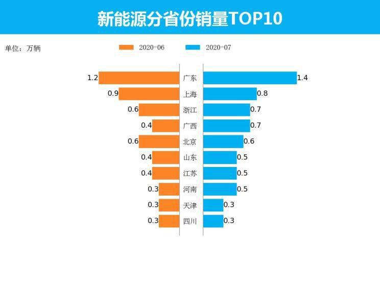 7月新能源車銷量最高的5個省份(直轄市)為廣東、上海、浙江、廣西、北京,銷量分別為1.4萬輛、0.8萬輛、0.7萬輛、0.7萬輛、0.6萬輛,占總銷量的48.5%。與上個月相比,上漲幅度最高的三個省份為吉林、河北、寧夏,上漲幅度分別為96.3%、90.2%、78.1%。