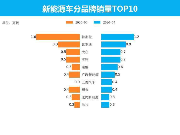 7月份的新能源市場,特斯拉依舊一騎絕塵,今年對于特斯拉來說將是突破的一年。具體到數(shù)據(jù)來看,我們結(jié)合7月“排水”后的上險數(shù)(已經(jīng)購買交強險的新能源車數(shù)量),特斯拉在本月的銷量達到了1.2萬輛,雖然相比6月有所下滑,但依舊領(lǐng)先比亞迪0.3萬輛。緊隨其后的分別為大眾、寶駿和榮威。其中榮威通過這一個月的優(yōu)秀表現(xiàn),成功殺進了前五名。
