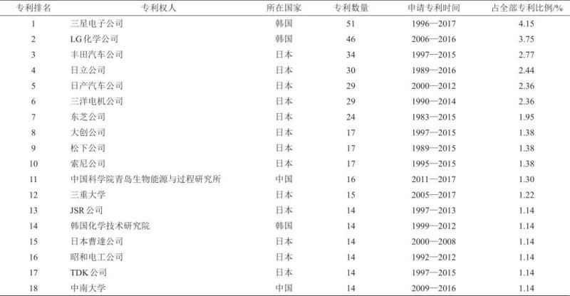 全球全固態(tài)聚合物電解質專利申請量排名前18位的專利權人情況如表4所示。其中前4名的專利數量較多,均達到了30件。前10名專利權人全部來自日本與韓國,并且都為全球知名企業(yè),可見日本、韓國在全固態(tài)聚合物電解質這一領域處于國際領先態(tài)勢。中國科學院青島生物能源與過程研究所、中南大學在該領域的專利數量進入全球前18名,分別排第11名與18名。在前10名專利權人機構中,日本的專利權人最多,占據8席,它們分別是:豐田汽車公司、日立公司、日產汽車公司、三洋電子、東芝電池公司、日本大創(chuàng)公司、松下集團以及索尼集團。此外,韓國占據2席,分別是三星電子公司與LG化學公司,并且包攬該領域專利數量的前2名。