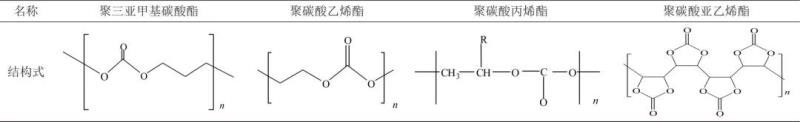 要獲得室溫離子電導率更高的全固態(tài)聚合物電解質,就要對聚合物官能團和鏈段結構進行精心設計和有效選擇才能夠有效減弱陰陽離子間相互作用,鏈段柔順性好的無定形結構聚合物是一類理想的全固態(tài)聚合物電解質基體材料,脂肪族聚碳酸酯就是其中一類。脂肪族聚碳酸酯基全固態(tài)聚合物含有強極性碳酸酯基團,介電常數高,是一類高性能全固態(tài)聚合物電解質。主要包括聚三亞甲基碳酸酯、聚碳酸乙烯酯、聚碳酸丙烯酯和聚碳酸亞乙烯酯等,其結構式如表2所示。
