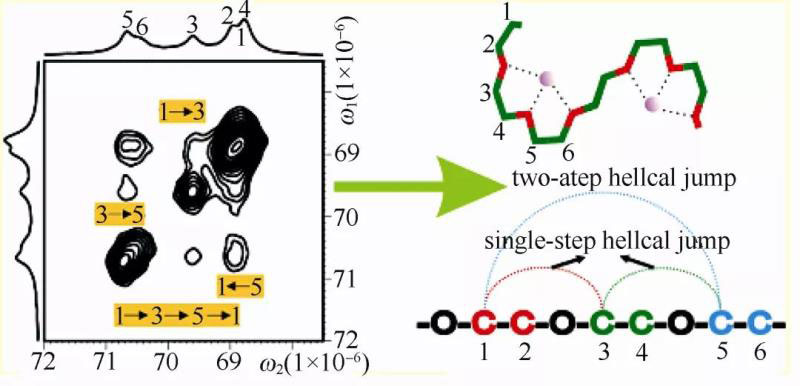 為深刻理解全固態(tài)聚合物電解質結構與電化學性能的構效關系,科學家對聚環(huán)氧乙烷基全固態(tài)聚合物電解質的離子傳導機理,電極/聚合物電解質界面性質以及聚合物與導電鹽相互作用等相關基礎問題進行了研究。1993年,BRUCE等利用DSC、NMR、交流阻抗譜等技術研究發(fā)現鋰離子在 PEO 晶相中是可以發(fā)生遷移的(圖1)。之后,華東師范大學CHEN等通過高分辨C13二維交叉固態(tài)核磁共振技術證實,離子在PEO晶相中的定向遷移伴隨著兩個過程,一是伴隨離子遷移的聚合物分子鏈段的局部運動;另一個則是離子運動伴隨著離子配位位置在聚合物鏈內和鏈間的變換。美國猶他大學SMITH等通過分子動力學模擬證實離子傳導主要在 PEO無定形區(qū)域內進行,一個Li+約與五個醚氧原子發(fā)生配位作用,且Li+的傳輸與PEO鏈段的局域松弛密切相關。最近,美國佛羅里達州國家強磁場實驗室的HU等通過選擇性同位素標記高分辨固態(tài)核磁技術研究了Li+的局域結構環(huán)境,并追蹤到Li+在PEO/鋰鑭鋯氧(LLZO)復合固態(tài)電解質中的遷移路徑,這有利于我們更深刻地洞察復合全固態(tài)電解質的離子傳輸機制。