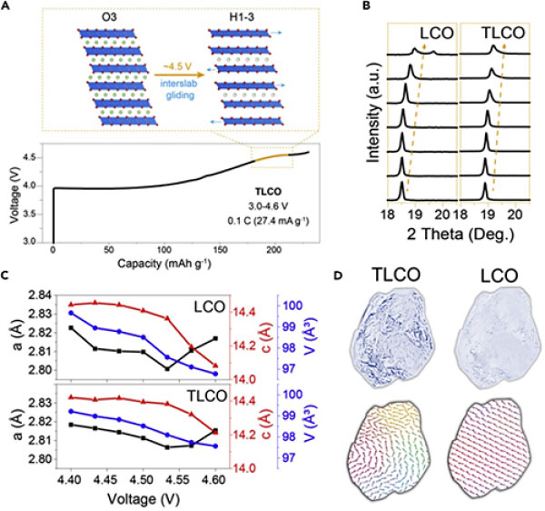 圖4. Ti-Mg-Al摻雜LiCoO2顆粒內(nèi)部缺陷調(diào)控充放電結(jié)構(gòu)相變機(jī)制