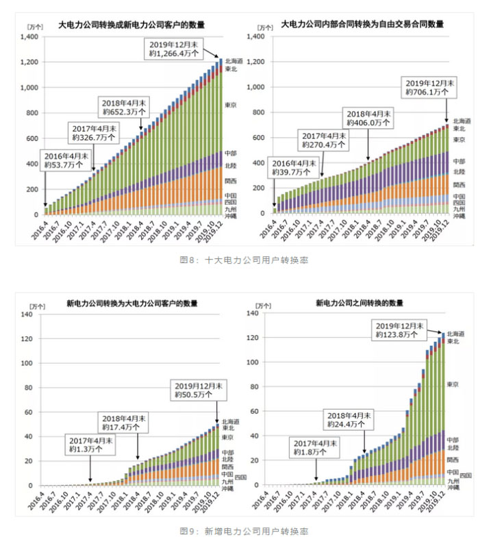 日本零售市場的電價以兩部制為主,但改革后的電價菜單比原來增加了3倍多。除了分時電價、分段電價之外,還有節(jié)電電價、運(yùn)動電價、特定時段免費(fèi)電價等各式各樣的電價套餐可供用戶選擇。零售電商不僅提供新的電價套餐,還不斷實(shí)現(xiàn)不同商業(yè)服務(wù)的整合和融合,提高服務(wù)附加價值。因此,以居民用戶為主的低壓市場用戶轉(zhuǎn)換率較高,如圖8所示,截止2019年12月,由大型電力公司轉(zhuǎn)換至新增電力公司的客戶數(shù)量達(dá)到1266萬個,2019年12月轉(zhuǎn)換率達(dá)到13.9%;大型電力公司內(nèi)部之間的合同轉(zhuǎn)換客戶數(shù)量也達(dá)到706萬個。如圖9所示,由新增電力公司轉(zhuǎn)換為大型電力公司的數(shù)量為51萬個,新增電力公司之間的互相轉(zhuǎn)換為124萬個。