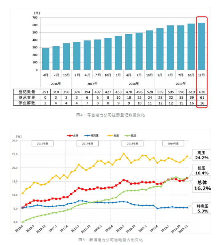 完善的電力市場需要有多元化的市場主體,通過市場“無形之手”,實(shí)現(xiàn)充分競爭,從而提升整個電力市場的效率。完全放開售電業(yè)務(wù)之后,日本新增電力公司注冊數(shù)量快速增長,截止2019年12月達(dá)到了630家(圖4)。所謂新增的電力公司是指十大電力公司之外新成立的零售電力企業(yè),他們是由燃?xì)?、石油、通信、工程建設(shè)、商社、交通和旅游等大型公司出資成立,形成了多元化的市場主體。新增的電力公司銷售電量占全社會售電量的比重穩(wěn)步提高,2019年新增電力公司售電量達(dá)1267億kWh,如圖5所示,銷售電量占全部售電量的比重達(dá)到16.2%,其中高壓市場占24.2%,低壓市場占16.4%,預(yù)計到2030年新增電力公司銷售電量占比將增加到27.6%[4]。