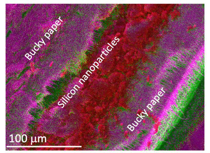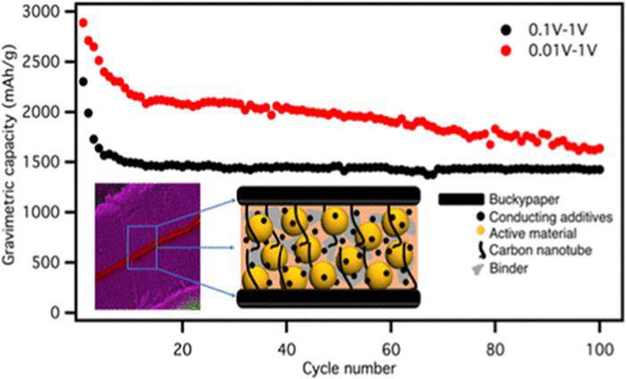 該研究的第一作者 Shailendra Chiluwal 表示:“獨立的碳納米管片使硅納米粒子之間保持電連接、這些納米管形成了一個準三維結(jié)構(gòu),即使在500次循環(huán)之后,也能將硅納米粒子保持在一起,并減輕了納米粒子破裂所產(chǎn)生的電阻”。
