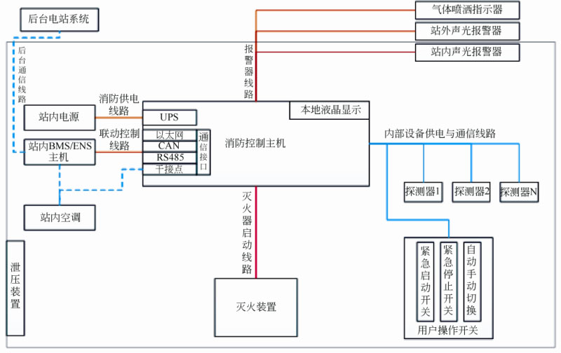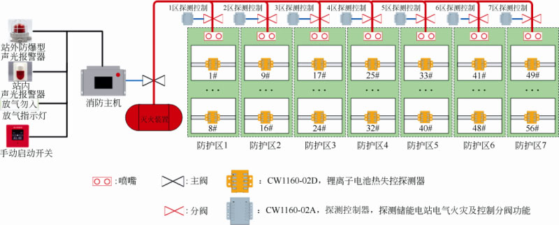 消防系統(tǒng)由熱失控探測器、消防控制主機(jī)、緊急啟停開關(guān)、聲光報警器、滅火裝置等部件組成。