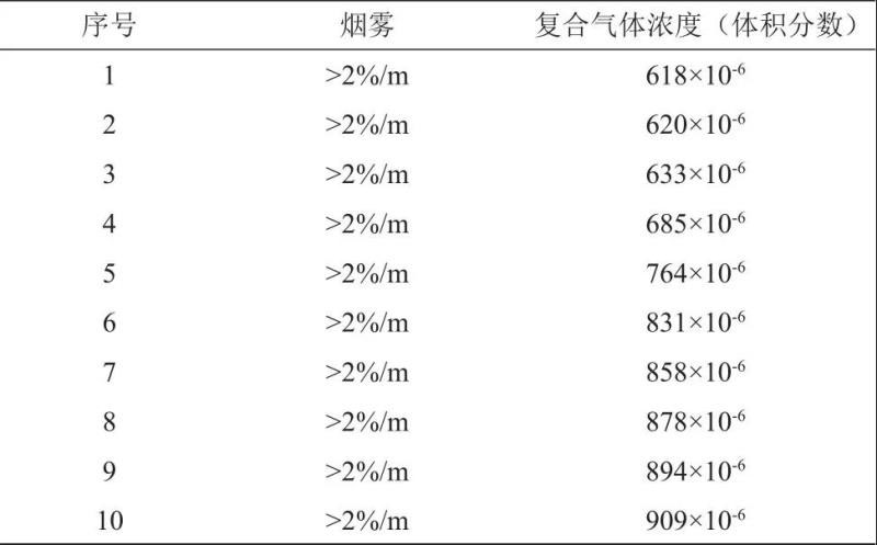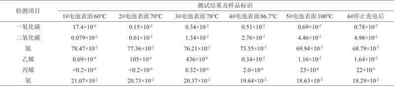 結(jié)合探測數(shù)據(jù)的圖表可以看出,鋰電池在防爆閥打開后并且熱失控發(fā)生前,產(chǎn)生大量的氣體和煙霧,并迅速超出了復(fù)合氣體傳感器的測量量程(體積分?jǐn)?shù))1000×10-6,具體數(shù)值參考表1。