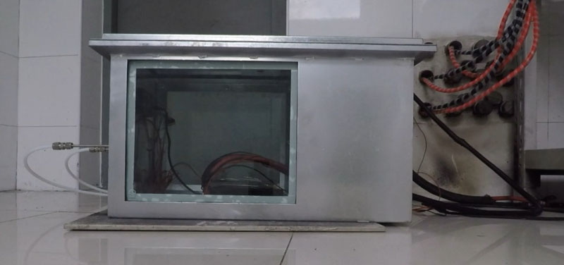 (2)試驗過程當(dāng)電池表面溫度達(dá)到58.7 ℃時,電池箱內(nèi)置傳感器的氣敏傳感器檢測出CO氣體并且濃度開始逐漸上升,通過觀察窗可以看到電池發(fā)生了輕微鼓包,此時電池表面溫度為58.7 ℃,一氧化碳濃度為(體積分?jǐn)?shù))20×10-6。試驗布置圖如圖5所示。