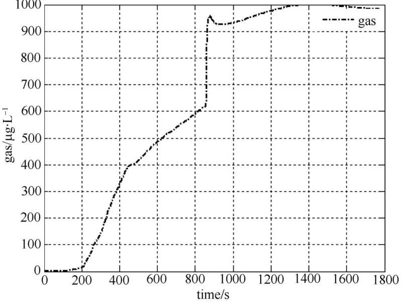 (2)試驗判定本次試驗中,電池材料受到加熱片加熱,產(chǎn)生氣體,復(fù)合氣體傳感器采集的氣體濃度呈平滑增長狀態(tài);鋰電池的泄壓閥在爆開后,復(fù)合氣體傳感器探測到的氣體濃度呈明顯上升狀態(tài),參考圖4。由此可以確認(rèn),可以使用某類氣體作為鋰電池?zé)崾Э卦缙陬A(yù)警的判斷依據(jù),該類氣體滿足以下條件:① 非空氣主要的構(gòu)成氣體;② 有相應(yīng)氣體傳感器對其進(jìn)行定量檢測;③ 電池防爆閥在打開前、后,該類氣體濃度有明顯對比。