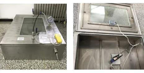 (1)試驗方案準(zhǔn)備IP67的熱失控氣體采集箱(帶兩個球閥、一個壓力表),用兩個300W加熱片對120 A·h磷酸鐵鋰電池進(jìn)行加熱,在進(jìn)行加熱試驗時,需要使用夾具將鋰電池和加熱片夾緊,防止電池在加熱的過程中由于電池殼體膨脹變形導(dǎo)致加熱片與電池殼體不能緊密連接,加熱片的熱量不能充分傳遞至電池,不能觸發(fā)電池?zé)崾Э?,?dǎo)致試驗失敗;在加熱片與電池的接觸面及電池背面部署溫度探測器;在實驗箱頂部部署動力電池?zé)崾Э靥綔y裝置,并使用監(jiān)控軟件實時監(jiān)測探測控制器的氣體、煙霧和溫度數(shù)據(jù),并對工程數(shù)據(jù)進(jìn)行存儲;電池放入采集箱,電池加熱相關(guān)準(zhǔn)備工作完成后,關(guān)閉采集箱門,鎖死箱門,關(guān)閉兩個球閥;部署攝像機(jī),對整個試驗過程進(jìn)行錄制,加熱過程中,溫度數(shù)據(jù)、控制器的傳感器數(shù)據(jù)及錄像時間需要校時;開始加熱電池工作,待檢測到電池防爆閥打開后,關(guān)閉加熱電源;打開球閥,開啟取樣泵,把取樣泵的氣體排放至安全區(qū)域,工作兩分鐘;把采氣袋接到采樣泵排氣管上,打開采氣袋閥門,開始取氣;取氣結(jié)束后,先關(guān)閉采樣泵,再關(guān)閉采氣袋閥門,最后關(guān)閉箱體上球閥。熱失控氣體采集箱整體布置見圖3。