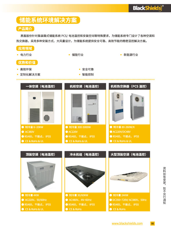 針對儲能系統(tǒng)不同部件的溫控要求,黑盾股份為客戶量身打造了各種溫控系統(tǒng),為儲能電站的建設和普及提供技術支撐,為電力系統(tǒng)的高效穩(wěn)定運行做出卓越貢獻。