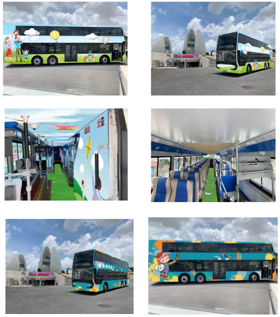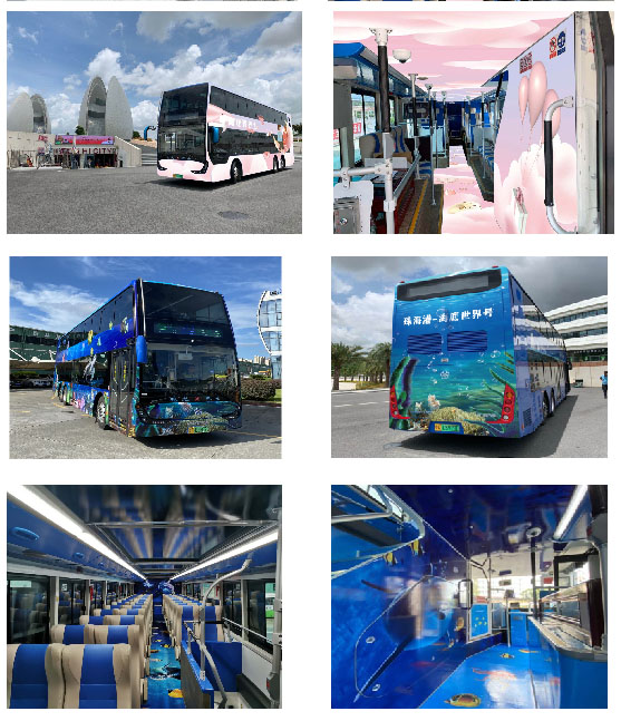 此批銀隆新能源雙層巴士車身及內(nèi)飾共設(shè)置了六種不同的主題,分別是:大好河山號(hào)、島嶼風(fēng)光號(hào)、親子游樂(lè)園號(hào)、卡通畫(huà)廊號(hào)、羅曼蒂克號(hào)、海底世界號(hào),為旅客們帶來(lái)精彩紛呈的乘坐感受與體驗(yàn)。以“海底世界號(hào)”為例,車身內(nèi)外主色調(diào)均為藍(lán)色,畫(huà)面包含海龜、水母及眾多色彩斑斕的海洋魚(yú)類,坐在車內(nèi),仿佛遨游在蔚藍(lán)的大海中,別有一番風(fēng)味。