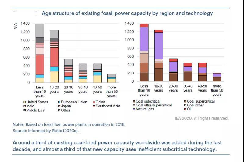 現有能源設施的在未來的碳排放與其壽命相關。以發(fā)電領域為例,在美國,現有煤電廠平均年齡超過40年,歐洲約35年,而大多數亞洲國家低于20年,在中國才13年。中國大約50%的現有火電在過去10年內投運,85%的容量在過去的20年里投運。在目前全球2100吉瓦的現有燃煤發(fā)電裝機容量(外加167吉瓦在建容量)中,到2050年仍有1440吉瓦繼續(xù)運行,其中900吉瓦在中國。相比之下,燃氣發(fā)電廠壽命較短?,F有的全球1800吉瓦燃氣發(fā)電裝機中(外加在建的110吉瓦),到2050年只有350吉瓦仍在繼續(xù)運行。