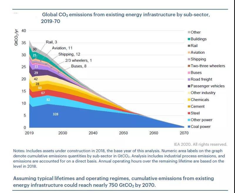 國際能源署(IEA)發(fā)表2020年版能源技術展望,其中評估了現有能源基礎設施的存量在剩余生命周期內(2019-2070年)的二氧化碳排放總量。