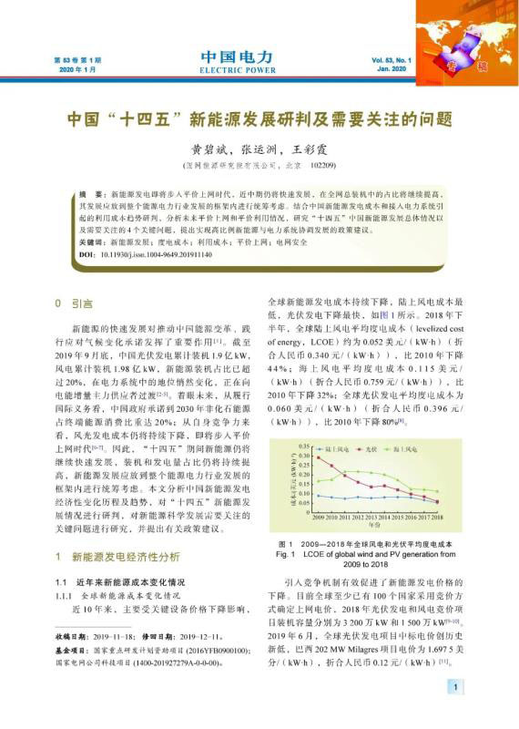 文章在分析全球和中國(guó)新能源發(fā)電成本變化歷程以及開(kāi)展大量訪談?wù){(diào)研的基礎(chǔ)上,研判了“十四五”風(fēng)電和光伏發(fā)電成本趨勢(shì),量化研究了各省新能源發(fā)電平價(jià)上網(wǎng)和平價(jià)利用情況,展望了中國(guó)“十四五”新能源發(fā)展前景。針對(duì)“十四五”期間新能源仍將保持快速發(fā)展,對(duì)電力系統(tǒng)安全運(yùn)行帶來(lái)更大挑戰(zhàn)的總體形勢(shì),系統(tǒng)研究了高比例新能源并網(wǎng)帶來(lái)的電力系統(tǒng)安全、新能源電力消納保障機(jī)制的政策落實(shí)、新能源平價(jià)上網(wǎng)帶來(lái)的規(guī)模調(diào)控、高滲透率分布式電源帶來(lái)的運(yùn)行管理等4個(gè)問(wèn)題,提出了政策和措施建議,可為政府部門、電網(wǎng)企業(yè)、發(fā)電企業(yè)決策提供重要支撐,對(duì)于推動(dòng)高比例新能源融入電力系統(tǒng)、實(shí)現(xiàn)安全可靠經(jīng)濟(jì)發(fā)展具有重要意義。