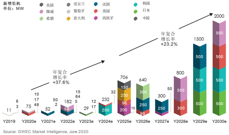 圖:2020-2030年全球漂浮式風(fēng)電新增裝機(jī)預(yù)測(cè)