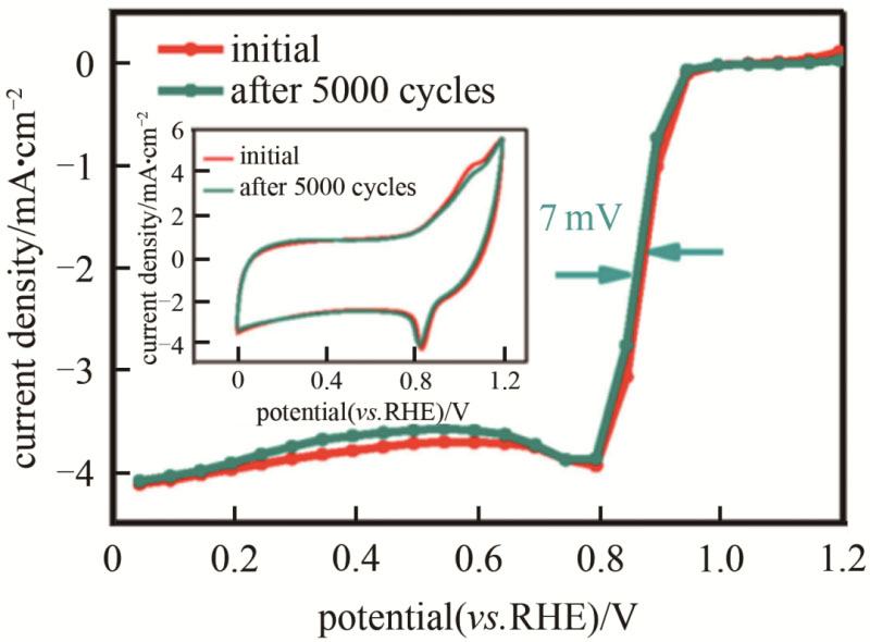 圖6 Co@hNCTs-800經(jīng)過(guò)5000次循環(huán)后的LSV和CV曲線