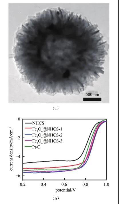 圖4 (a) Fe3O4@NHCS的TEM圖;(b) ORR極化曲線圖