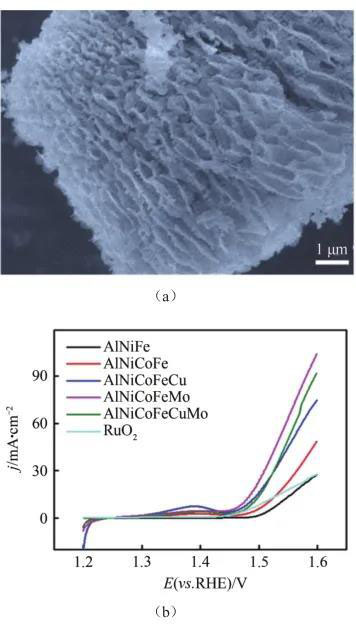 增加催化劑的化學(xué)復(fù)雜性,是調(diào)整催化劑活性的重要途徑。在單一固溶相中含有五種或五種以上金屬的合金通常被稱為高熵合金(HEAs),它們表現(xiàn)出不同尋常的穩(wěn)定性和耐腐蝕性,同時(shí)也提供了一個(gè)調(diào)節(jié)合金表面電子性質(zhì)和催化活性的平臺(tái),HEAs在催化和能量?jī)?chǔ)存/轉(zhuǎn)化方面有著巨大的應(yīng)用前景。Qiu等利用脫合金法制備了納米多孔高熵合金(np-HEAs)電催化劑[圖3(a)],其中以np-AlNiCoFeX(X=Mo,Nb,Cr)五元體系的OER催化活性最高[圖3(b)]。分析表明,在一個(gè)單相納米結(jié)構(gòu)中加入五種或多種過(guò)渡金屬元素具有協(xié)同作用,克服了常規(guī)二元或三元合金的限制,五元體系的形成大大提高了電化學(xué)循環(huán)的穩(wěn)定性,同時(shí)也為提高催化性能提供了更多的結(jié)構(gòu)和化學(xué)自由度。