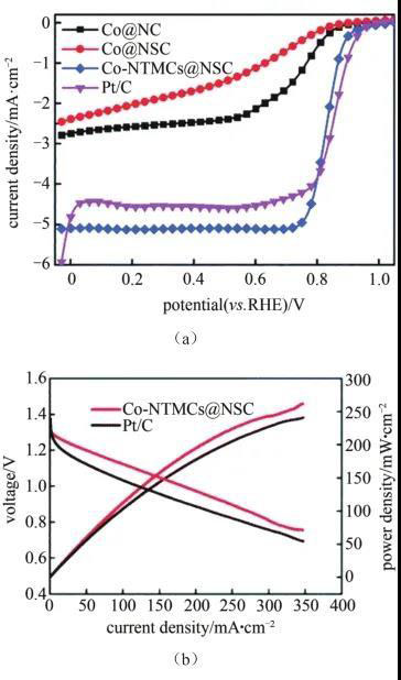 過(guò)渡金屬本身具有高催化活性,但抗氧化性能差。研究發(fā)現(xiàn),過(guò)渡金屬顆粒和碳材料復(fù)合作為ORR和OER雙功能催化劑表現(xiàn)出強(qiáng)的催化性能。在這種復(fù)合結(jié)構(gòu)中,過(guò)渡金屬可以增加碳化過(guò)程中碳材料的石墨化程度,包裹在表面的碳材料可以有效的防止金屬團(tuán)聚以確保分散,同時(shí)可以促進(jìn)電子的轉(zhuǎn)移。Zhu等通過(guò)功能聚合物的可控自組裝制備了鈷摻雜含氮和硫的多孔碳球(Co-NTMCs@NSC),Co原子均勻分布在碳球表面,提高了材料本征催化活性。測(cè)試顯示ORR半波電位為0.833V[圖2(a)],在堿性介質(zhì)中具有良好的耐甲醇能力和長(zhǎng)期的耐用性。此外,它還表現(xiàn)出高效的OER催化活性,在10 mA/cm2下具有284 mV的過(guò)電位。用作可充電鋅空氣電池的空氣陰極時(shí),在充放電循環(huán)的12 h內(nèi)顯示出高的峰值功率密度262 mW/cm2[圖2(b)]和小的充放電電壓間隙,優(yōu)于Pt/C基空氣陰極。Ma等同樣采用高溫?zé)峤饩酆衔锓ㄖ苽淞颂技{米管包覆合金納米粒子催化劑,作為鋅空氣電池空氣陰極催化劑時(shí)顯著地提高了電池的循環(huán)穩(wěn)定性,并表現(xiàn)出高的峰值功率密度。