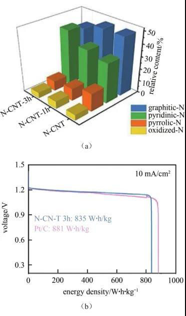Yang等通過(guò)熱解三聚氰胺和L-半胱氨酸混合物,控制碳化溫度,制備出了高活性的氮摻雜三維石墨烯納米帶網(wǎng)絡(luò)(N-GRW),在鋅空氣電池中的開(kāi)路電壓為1.46 V,峰值功率密度和比容量分別為65 mW/cm2和873 mA·h/g,具有良好的循環(huán)穩(wěn)定性,分析認(rèn)為吡啶氮結(jié)構(gòu)起主要催化作用。為了提高吡啶氮的含量,Yi等利用高錳酸鉀刻蝕空心管型聚吡咯制備了氮摻雜碳納米管,通過(guò)刻蝕碳材料引入了豐富孔結(jié)構(gòu)和缺陷,使得更多N原子處在邊緣位置,吡啶氮的含量由32.8%提升到了45.2%[圖1(a)],該催化劑在堿性條件下具有優(yōu)于商業(yè)Pt/C的半波電位(0.83 V)和穩(wěn)定性,應(yīng)用于鋅空氣電池中,顯示出122 mW/cm2的峰值功率密度和835 W·h/kg的能量密度[圖1(b)],與商業(yè)Pt/C近似。