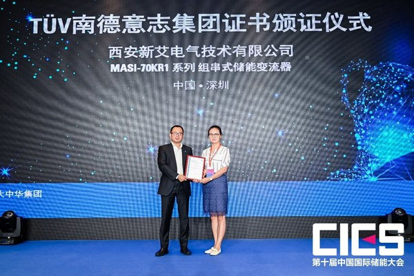 中國儲能網(wǎng)訊:9月24-26日,由中國化學(xué)與物理電源行業(yè)協(xié)會主辦、TUV南德意志集團(tuán)(以下簡稱“TUV南德”)聯(lián)合主辦、中國化學(xué)與物理電源行業(yè)協(xié)會儲能應(yīng)用分會、中國儲能網(wǎng)承辦的第十屆中國國際儲能大會在深圳鵬瑞萊佛士酒店隆重召開。大會吸引了全球儲能行業(yè)眾多領(lǐng)軍企業(yè)參與,共同探討儲能技術(shù)在高安全、低成本、長壽命以及資源再利用全生命周期的研究與布局,推動儲能價(jià)值的市場機(jī)制建設(shè)、推進(jìn)先進(jìn)大容量儲能系統(tǒng)技術(shù)在高比例可再生能源電網(wǎng)的規(guī)?;瘧?yīng)用,有力構(gòu)建以市場為導(dǎo)向的綠色技術(shù)創(chuàng)新體系。9月25日,在儲能安全、標(biāo)準(zhǔn)與檢測分會場上,TUV南德為西安新艾電氣技術(shù)有限公司(以下簡稱“西安新艾電氣”)組串式儲能變流器MASI-70KR1系列頒發(fā)TUV SUD認(rèn)證證書。TUV南德大中華集團(tuán)智慧能源事業(yè)部副總裁許海亮,西安新艾電氣市場營銷部副總經(jīng)理周文姣等一席嘉賓出席了該頒證儀式。