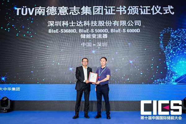 中國儲能網(wǎng)訊:9月24-26日,由中國化學與物理電源行業(yè)協(xié)會主辦,TUV南德意志集團(以下簡稱“TUV南德”)聯(lián)合主辦,中國化學與物理電源行業(yè)協(xié)會儲能應用分會、中國儲能網(wǎng)承辦的第十屆中國國際儲能大會在深圳鵬瑞萊佛士酒店隆重召開。大會吸引了全球儲能行業(yè)眾多領軍企業(yè)參與,共同探討儲能技術(shù)在高安全、低成本、長壽命以及資源再利用全生命周期的研究與布局,推動儲能價值的市場機制建設、推進先進大容量儲能系統(tǒng)技術(shù)在高比例可再生能源電網(wǎng)的規(guī)?;瘧?,有力構(gòu)建以市場為導向的綠色技術(shù)創(chuàng)新體系。9月25日,在儲能安全、標準與檢測分會場上,TUV南德為深圳科士達科技股份有限公司(以下簡稱“深圳科士達”)BluE系列儲能變流器頒發(fā)TUV SUD安全認證證書。TUV南德大中華集團智慧能源事業(yè)部副總裁許海亮,深圳科士達認證部總監(jiān)李彬等一席嘉賓出席了該頒證儀式。該證書的獲得,為科士達進一步進軍儲能國際市場奠定了良好的基礎。