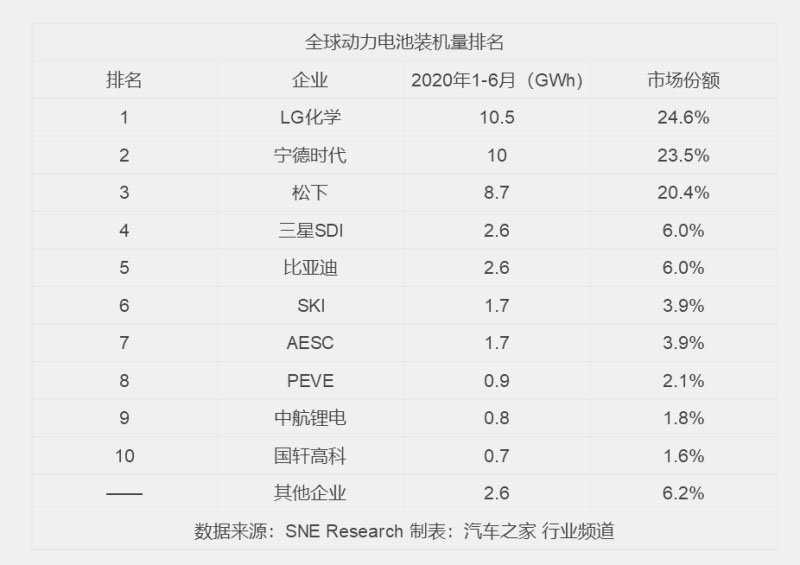 按照SNE Research統(tǒng)計(jì),2020上半年全球前十動(dòng)力電池企業(yè)裝機(jī)量為40GWh,占全球動(dòng)力電池裝機(jī)量的94%,市場(chǎng)集中度進(jìn)一步提升,其中排名前三名分別為L(zhǎng)G化學(xué)、寧德時(shí)代、松下。
