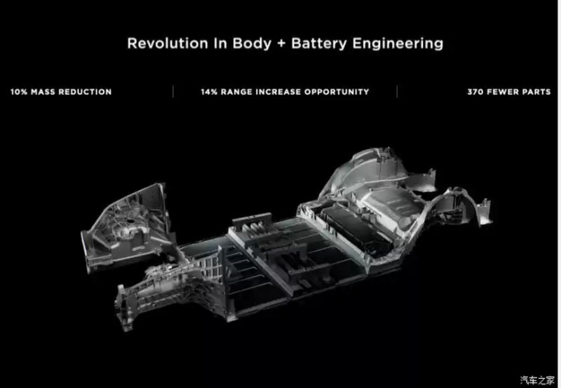 整車制造:特斯拉開發(fā)出一種全新的車身架構(gòu),將電池包設(shè)計(jì)為車身結(jié)構(gòu)件,將電池包和車身前后部一體化成型,此結(jié)構(gòu)帶來(lái)更高強(qiáng)度車身,同時(shí)車輛的重量分布也更靠近中心,帶來(lái)更靈活的操控性。為了實(shí)現(xiàn)這一設(shè)計(jì),特斯拉專門研發(fā)合金材質(zhì),加強(qiáng)車身強(qiáng)度。這一車身架構(gòu)將提升14%的續(xù)航里程,將整體結(jié)構(gòu)減重10%,并減少370個(gè)零件。