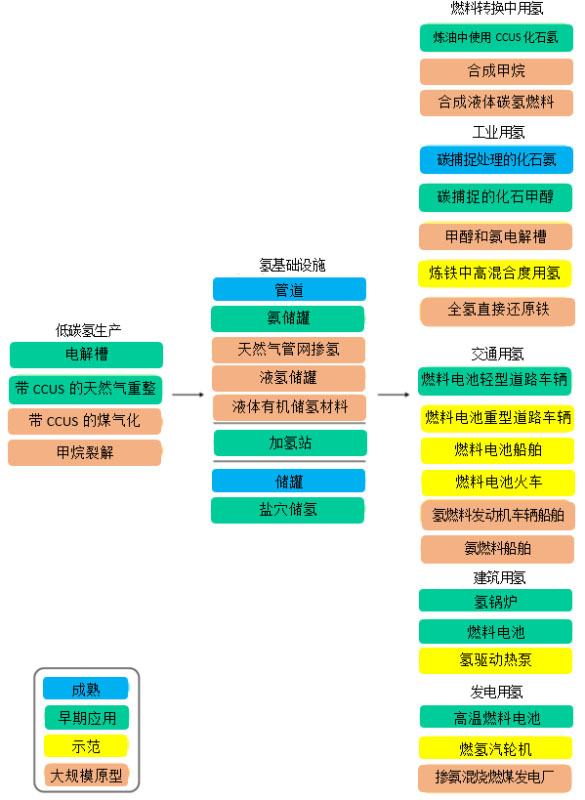 IEA認為,目前的低碳氫價值鏈中,氫的生產(chǎn)、運輸、儲存和應用所需的各項技術都處于不同的成熟階段,并面臨特定的技術問題(圖1)。