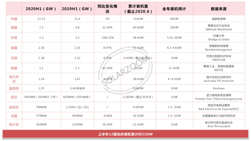 答案是2020年12國上半年光伏裝機(jī)累計約31GW,略高于2019年上半年的30GW。