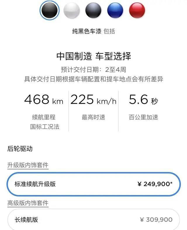 10月1日,特斯拉中國官網(wǎng)顯示,中國制造Model 3標(biāo)準(zhǔn)續(xù)航升級版補貼后售價為24.99萬元,中國制造Model 3長續(xù)航后輪驅(qū)動版補貼后售價30.99萬元。更新后的中國制造Model 3標(biāo)準(zhǔn)續(xù)航升級版的續(xù)航里程獲得了20公里以上的有效提升,國標(biāo)工況法下綜合續(xù)航里程為468公里,最高時速225公里/小時,百公里加速時間為5.6秒,享受同等的整車質(zhì)保和電池質(zhì)保。
