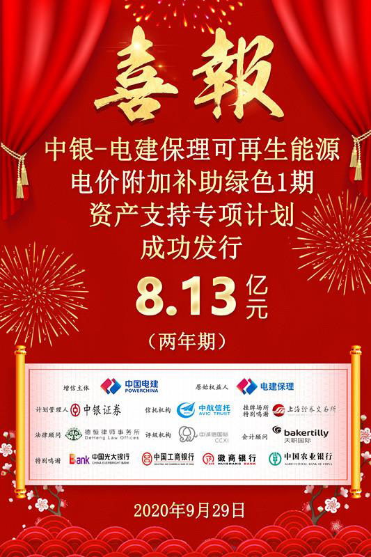 9月29日,電建保理公司成功發(fā)行中銀-電建保理可再生能源電價(jià)附加補(bǔ)助綠色1期資產(chǎn)支持專項(xiàng)計(jì)劃,發(fā)行規(guī)模為8.13億元,期限2年。