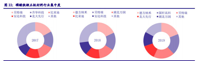 磷酸鐵鋰正極:德方納米勢(shì)頭良好,前 5 大廠商市占率相近。相比于仍處于競(jìng)爭(zhēng)狀態(tài)的三元材料市場(chǎng),磷酸鐵鋰正極材料領(lǐng)域呈現(xiàn)更高的集中度。2017 年前五廠商市占率為 69%,2019 年前五廠商市占率已高達(dá) 83%,德方納米勢(shì)頭良好,排名第一。