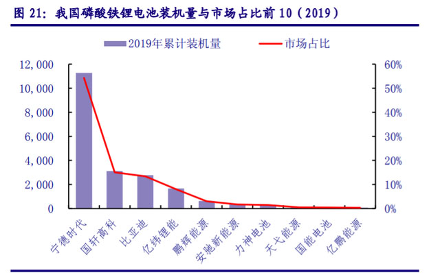 磷酸鐵鋰電池:寧德時(shí)代一枝獨(dú)秀,市場(chǎng)集中度高。2019 年寧德時(shí)代磷酸鐵鋰電池市場(chǎng)占比超 50%,仍然是電池行業(yè)的絕對(duì)龍頭。磷酸鐵鋰電池市場(chǎng)排名前五的企業(yè)約占市場(chǎng)份額的 93.77%,集中度高。其中,排名 2-5 名的分別為國(guó)軒高科、比亞迪、億緯鋰能和鵬輝能源,合計(jì)裝機(jī)容量 8211.3Gwh,市場(chǎng)占比 39.52%。