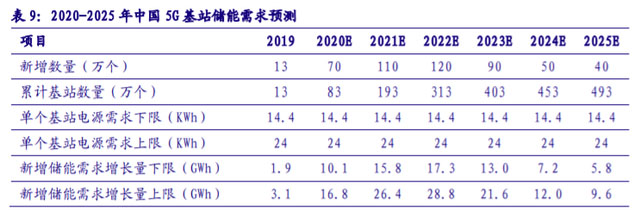 5G 儲(chǔ)能市場(chǎng)即將進(jìn)入高速發(fā)展期。根據(jù)中國(guó)產(chǎn)業(yè)信息網(wǎng)數(shù)據(jù),2019 年我國(guó)新增 5G 基 站 13 萬(wàn)個(gè),相應(yīng)新增儲(chǔ)能需求約為 1.9-3.1Gwh,2020-2025 年將會(huì)是 5G 建設(shè)的高峰期, 到 2025 年預(yù)計(jì)累計(jì)新增基站數(shù) 493 萬(wàn)臺(tái),對(duì)應(yīng)“十四五”儲(chǔ)能合計(jì)空間為 59-98GWh。