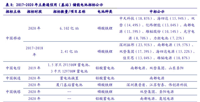 基站建設(shè)儲(chǔ)能電池招標(biāo)公示顯示,磷酸鐵鋰電池正在逐步替代鉛蓄電池成為 5G 基站 儲(chǔ)能電池首選。根據(jù)《儲(chǔ)能系統(tǒng)白皮書(shū)》,2018 年全球新投產(chǎn)儲(chǔ)能電池裝機(jī)量中磷酸鐵鋰 電池占比已達(dá)到 76%,國(guó)內(nèi)儲(chǔ)能項(xiàng)目中磷酸鐵鋰電池占比也達(dá)到了 71%。運(yùn)營(yíng)商接連在基 站建設(shè)上轉(zhuǎn)型試驗(yàn)磷酸鐵鋰電池:2018 年開(kāi)始,中國(guó)鐵塔已停止采用鉛酸蓄電池,大規(guī)模 采購(gòu)磷酸鐵鋰電池,2019 年移動(dòng)發(fā)布磷酸鐵鋰電池產(chǎn)品常態(tài)化測(cè)試,2020 年 8 月中國(guó)聯(lián) 通發(fā)布磷酸鐵鋰電池測(cè)試公告。2020 年,中國(guó)鐵塔兩次招標(biāo)磷酸鐵鋰電池建設(shè) 5G 基站; 2017 年中國(guó)移動(dòng)發(fā)布招標(biāo)公示,采購(gòu) 2.4 億 Ah 磷酸鐵鋰電池,2020 年 3 月 4 日,采購(gòu) 25 億元通信用鐵鋰電池 6.1 億 Ah。